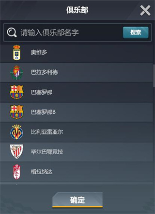 选择俱乐部前,必须先选择联赛,然后可查看到该联赛内的所有俱乐部,选中想选择的俱乐部后点击确定按钮即可。继续点击搜索即可查看所有该俱乐部的球员信息。