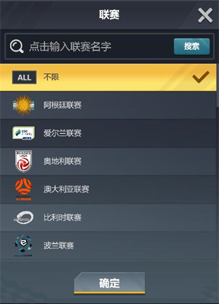 该列表会显示各大足球联赛,搜索框可输入关键字搜索想选择的联赛,选中想选择的联赛点击确定按钮即可。继续点击搜索即可查看所有该联赛的球员信息。