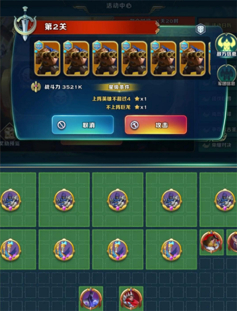 接下来是第二关,这一关有点复杂,需要你注意军团信息和战斗力。你需要上阵的英雄不超过4星,并且不能上阵巨龙。这一关的战斗主要依靠你的英雄阵容和战术。