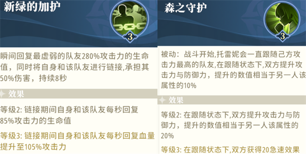 奶妈、伤害拐和充能拐三位一体的全能型增益伙伴。一技能提供全队能量回复,二技能增加友方单位的暴击和爆伤,三技能提供瞬时治疗和持续治疗,并且能够分担伤害。被动技能提升友方核心伙伴的综合属性,综合下来实用性拉满。