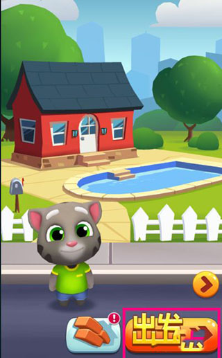 1、进入此游主画面后,看到汤姆的庭院,在这里要不断提晋从而一直建起,点击右角‘出发’的黄钮。