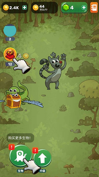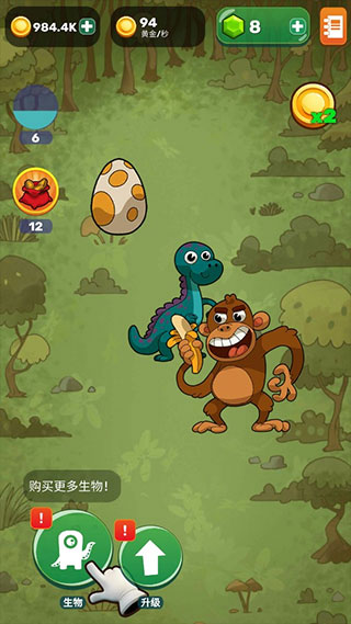 2、当合并进化完成后,需要等待一定的时间,才会出现新的蛋,在等待的过程中,玩家可以疯狂点击新生物,收集大量金币,注意等级越高的生物,点击收获的钱越多。