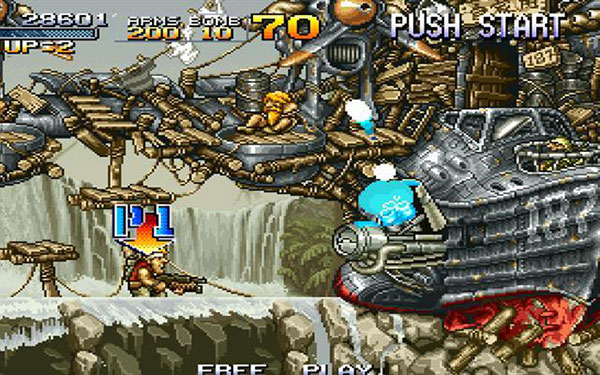 下面不要立刻去坐坦克因为上方会有士兵下来砍你,可以等其跳下去后再进坦克,前方那些扔滚雷的士兵要及时解决,如果要捞分可以先不过去,然后跳出坦克砍上面下来的士兵,不过很危险。BOSS处如果等时间就有大量的人质下来。