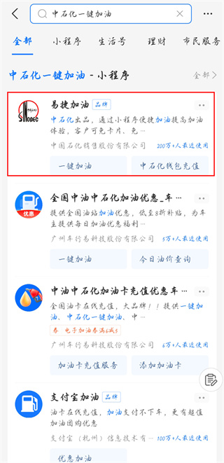 5、通过支付宝一键加油方法:打开支付宝,在首页搜索进入中石化一键加油小程序,点击【钱包加油】,根据提示填写开通信息后开通石化钱包。