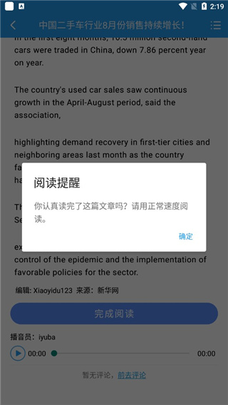 4、如果你只是走马观花的读完一篇文章,系统会智能提醒你是否认真读完这篇文章;