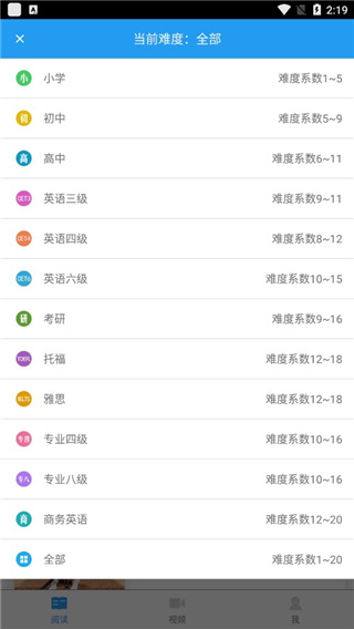 5、回到首页,选择左上方的栏目条进入,这里可以选择你的英语水平;