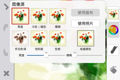 注意:使用画笔时,要留意自己有没有点击「色彩源」或「原图效果」。如果点击了「色彩源」,画笔填充的是色彩源所选颜色。点击「原图效果」则画笔填充的颜色是智能提取的色彩。