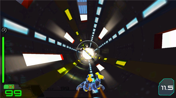 小编玩到5000米左右机器人会进入一个隧道,这时候机器人的飞行位置是靠重力感应来操控的,玩家翻转游戏设备控制机器人的飞行位置,屏幕上翻机器人隧道顶部飞行,左右翻转机器人左右移动飞行,下翻在隧道底部飞行。