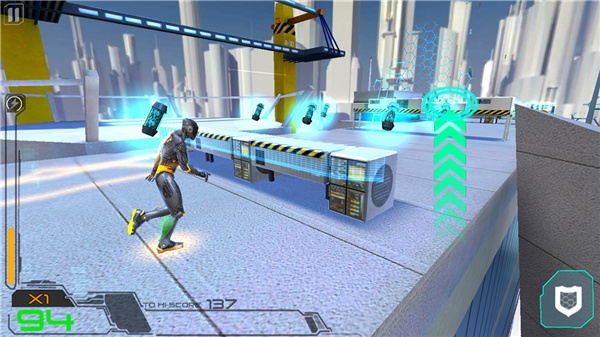 机器人跑酷竞赛需及时跑过一座未来城市,伴之以快节奏配乐。