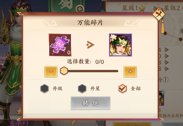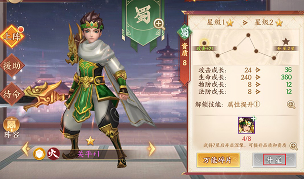 5、万能碎片可以代替武将碎片进行升星,万能碎片是极其珍贵的资源,使用时一定要慎重,建议万能碎片对高资质的式将使用。