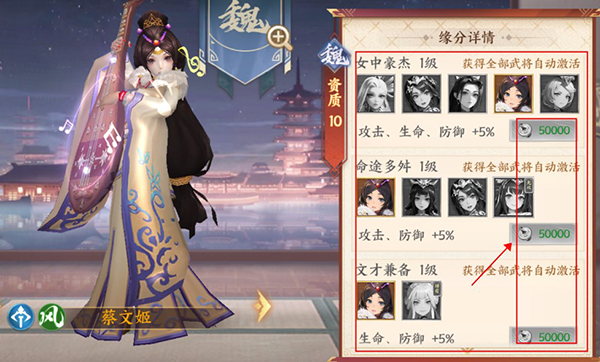 2、缘分可以升级,将缘分武将提高到特定的星级,则可提高本缘分的等级
