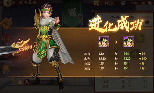 当达到特定的等级时,可以通过消耗进化石等一系列材料进行武将进化,武将进化后,基础属性(攻击、双防、生命)会有非常大的提升,并且随着进化等级提高,加成也会越来越高。