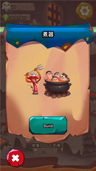 地狱英雄是一款以地狱为主的放置类游戏,游戏界面卡通可爱,点击空地,开始建造并装备空间。滑动屏幕收集灵魂,一开始先收集20个灵魂。