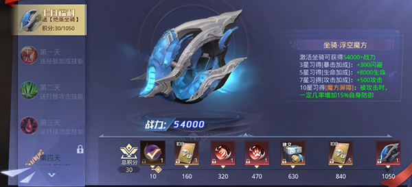 3、七日福利:每日都有福利任务,完成任务积累积分就能领取豪礼,积分达到最高就能免费获得红色坐骑浮空魔方。