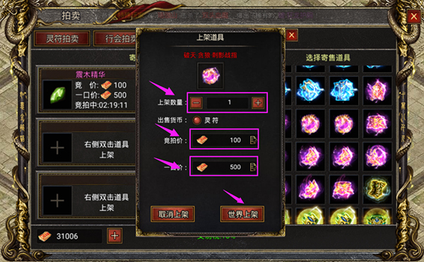 通过击杀BOSS获得多余装备不想回收的,可以挂上拍卖行进行交易,价格数量自己定,最后点击世界上架即可。兄弟们在这个拍卖行交易获取的灵符收入,系统将统一收取10%的交易税,上架商品拍卖时间为4小时,超过4小时无人竞价便会流拍并通过邮件返还,之后需要手动重新上架。