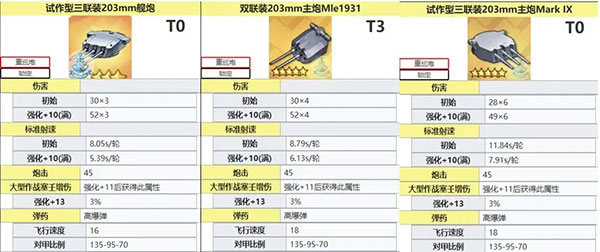 三联203markIX(右一),最强高爆弹之一,装备研发制造,dps高于阿尔及利亚炮,低于路易炮。射速较慢。