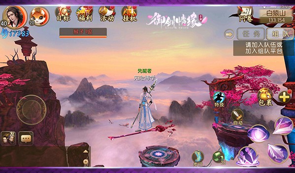 玩家角色到达40级后,点击主界面下方“御剑”按钮即可进入御剑姿态,可手动控制御剑高度及方向,手指拖动屏幕来调整视角,同时配合摇杆进行飞行