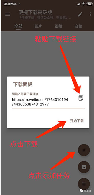3、打开便捷下载,点击添加任务,粘贴链接,开始下载。