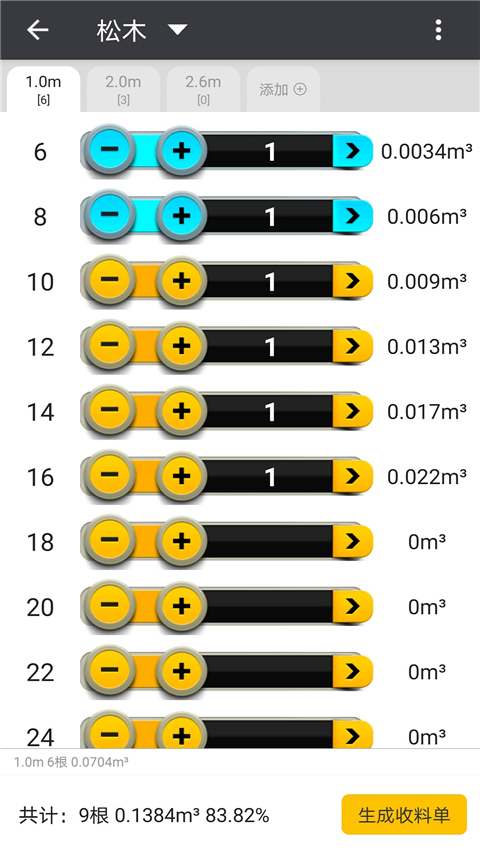 4、自动计算材积,分树种长度计算,结果一目了然。