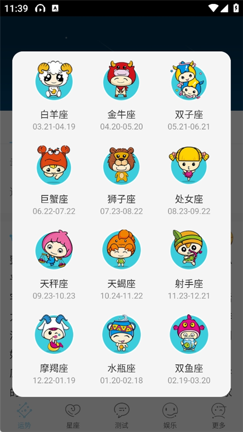 4、全面预测各个星座的运势情况,会系统的将预测的星座运势反馈到手机内,随时查看。