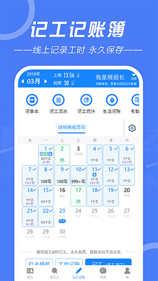 4、建筑记工记账:手机一键记工,记录数据永久保存。