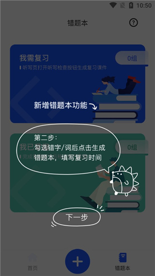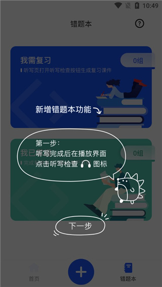 6、返回首页进入错题本板块,这里是新增的功能,听写完成后在播放界面检查耳机图标;