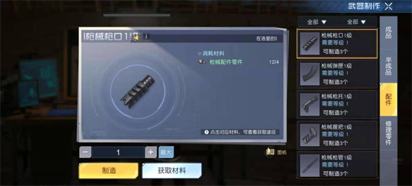 获取武器配件,需要庄园中武器制作台,玩家可以在武器制作界面中找到配件一栏。在目前版本中,配件制作材料均可以在商店中直接购买,而玩家只需要付出少量的银币就可以。整体来讲,获取难度非常低。