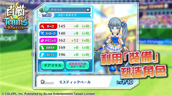 5、另外,玩家可以利用“装备”塑造角色,为心爱的角色更换酷炫的“球拍”与“球鞋”,提升角色等级,打造自己专属特色的网球选手。而且玩家熟悉且喜爱的“星盘”也将在这里再现,藉由“星盘”可以强化及解放角色的各项技能来顺利赢得胜利。
