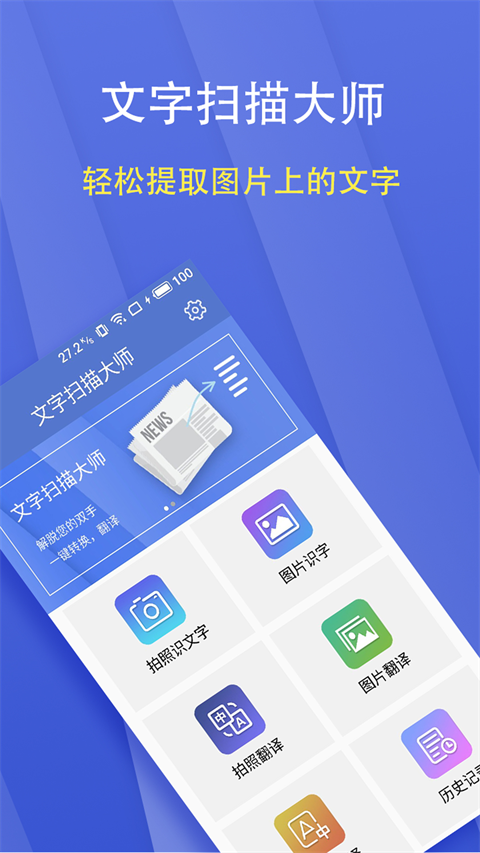 文字扫描大师ocr手机版是一款拍照扫描转化文字的软件,软件功能非常的丰富有拍照识文字、图片识字、拍照翻译、图片翻译、文字翻译等,可以满足用户各种日常的办公学习需求,提升工作效率。软件可以通过拍照快速的获取照片中的文字,精准快速,可以轻松的录入图片中的文字内容,大大的提高文字录入效率,同时还支持一键翻译识别的文字,可以识别英语、日语、韩语等16种语言,快速外语学习翻译。另一方面,文字扫描大师ocr手机版的功能排版非常的合理,页面非常的简约,在使用过程种没有任何的广告和弹窗,一键识别翻译,操作步骤简单,致力于给用户清爽的使用体验,感兴趣的用户快来3322下载战下载体验吧!