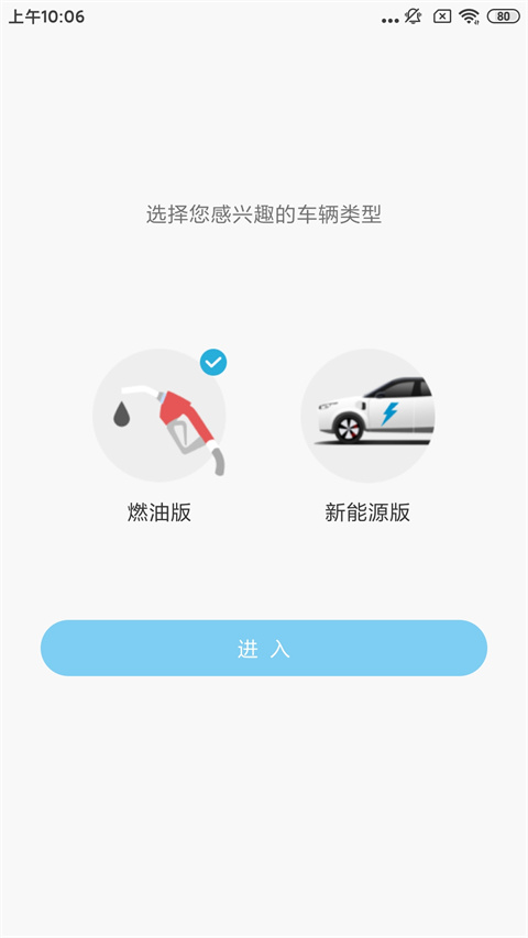 2、选择你感兴趣的车辆类型,这里有燃油版和新能源版两种,然后点击进入;