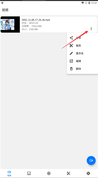 10、点击录制视频后面还有一个选项,点击打开还可以对其视频进行分享、裁剪、重命名、编辑、删除;