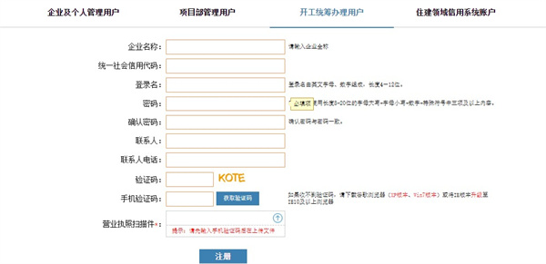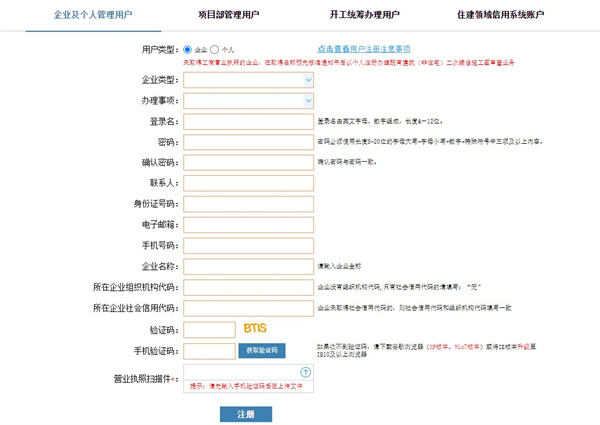 3、可以选择企业及个人管理用户、项目部管理用户、开工统筹办理用户、住建领域信用系统账户,大家可以根据自己的需求进行选择;