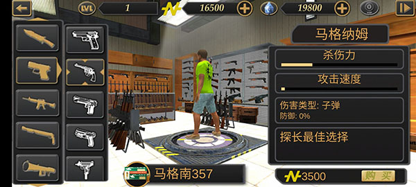 价格:3500金币,伤害类型:子弹;使用马格南357子弹,杀伤力较低,攻击速度极慢;探长最佳选择。