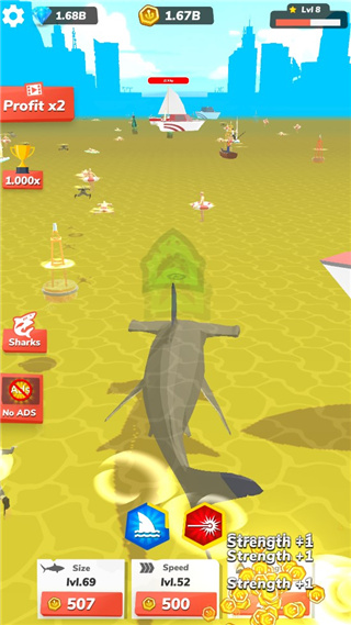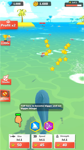 2、再次点击右上角的升级,你可以获得相应的金币;升级后甚至可以追杀比自己更大的鲨鱼;