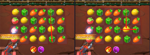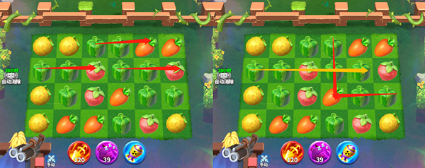 四消和五消的攻击效率是最高的,所有尽可能的凑出四消五消。但在4*6的方格上,水果成线排列概率是较小的;而在出现L型或T型结构时,四消五消的概率会变大。如图,如果选择竖向消除(左侧),则是四消;若选择T型消除(右侧),则可完成五消。除此之外,L型和T型消除后,可带来纵向和横向两个方向的布局变化,这比线型消除更容易出现有利于消除的布局