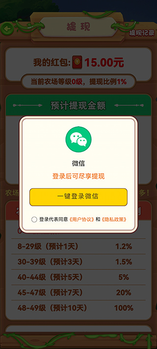 玩家点击上方提现按钮,即可开始提现,现金红包满0.3元即可提现,而且等级越高红包兑换的现金红包比例越大。