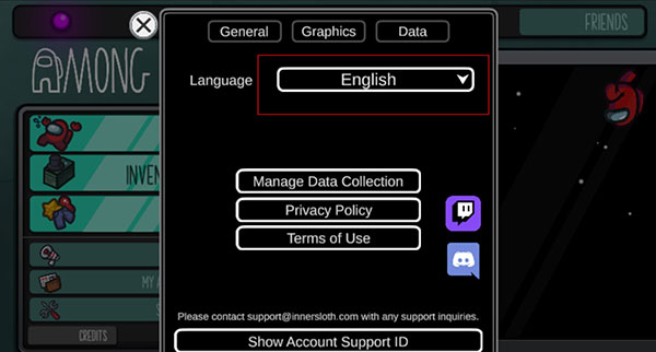 注意:需在最上方填写英文名字后才可进入房间;如遇无法进入游戏,请点击右下角小地球仪切换成“North America”地区即可进入。点击下方齿轮,选择DATA界面,看到English点击向下滑动看到中文即可切换为中文,进不去的玩家请搭配加速器使用。