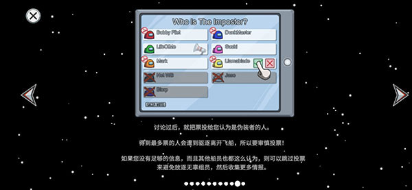7、讨论过后,就把票投给您认为是伪装者的人。得到最多票的人会遭到驱逐离开飞船,所以要审慎投票!如果您没有足够的信息,而且其他船员也都这么认为,则可以跳过投票来避免放逐无辜组员,然后收集更多情报。