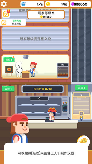 6、比如我们可以招募经理来监督工人们制作汉堡、进行售卖以及操控升降机等。