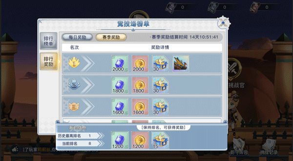 竞技场系统中,拥有【每日榜单】和【赛季榜单】。【每日榜单】中每天05:00会根据当前竞技积分排名邮件发送每日奖励;【赛季榜单】每14天根据玩家积分排名结算一次,排名靠前的玩家,可以获得丰富的钻石、英雄和皮肤奖励,平常记得多参与哦。