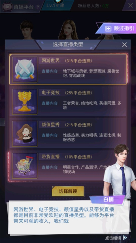 5、接下来玩家就可以根据签约的主播特色来选择直播类型了。