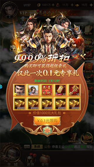 1、0.1元专享礼,9999%折扣,购买就送神将曹操和后宫热巴