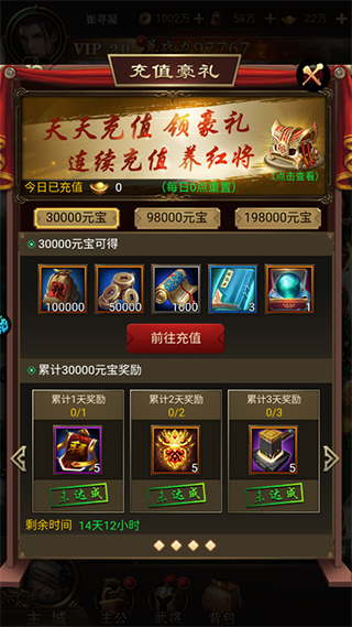 5、累充达到一定数额就送超值豪礼包括十万兵粮食、五万铜钱、大量主公经验,还有明珠后宫礼物!