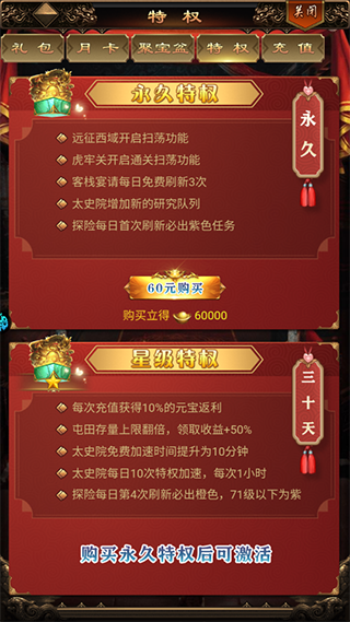4、GM永久特权!开启关卡扫荡功能,太史院增加新的研究队列,每日探险必出紫色任务!