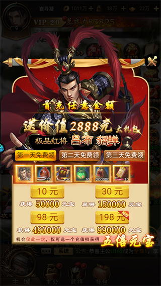 2、首充任意金额(包括上图的0.1哦)就送极品红将吕布貂蝉还有大量金元宝!