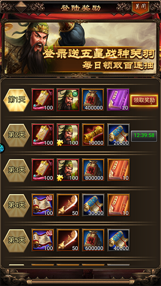 3、登录就送五星战神关羽,还有百连抽,助力主公扩大军团实力