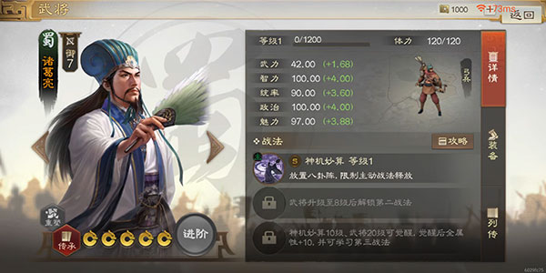 2、当看到诸葛亮的面板属性时,相信很多玩家都如小编一样被完美的属性所震撼,智力已经达到了全游戏最高的初始116,成长也是最高的4.0,这就使得诸葛亮越到后期越能拉开和其他武将的差距。拥有极高的智力属性带来超高谋略输出能力,再加上自身属于弓兵型武将,本身就具有20%的主动战法伤害加成,这样综合下来诸葛亮手中的战法要比其他人高出很多。