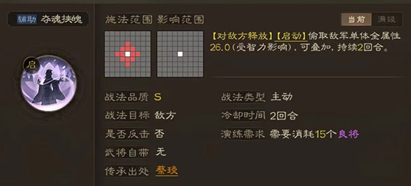 3、那么在最终战法选择上就有两个不同的路线,分别是输出和治疗以及辅助。如果走输出路线,自然是选择夺魂挟魄和石兵八阵。石兵八阵是群体伤害类型,同时能强制目标向中心移动,能够强制位移的技能并不多,除了伤害之外,还能起到很强的战术应用效果。夺魂挟魄属于能偷取属性的技能,每个回合之后都能发动并且投来的全属性还能叠加,适用于持续战斗。