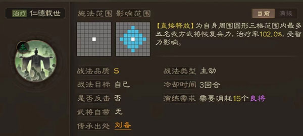 4、如果走辅助及治疗路线,技能搭配就变为了仁德载世和杯蛇鬼车,仁德来自于刘备,按照自身站位对周围进行治疗,杯蛇鬼车同样是大范围回血,但同时也能附加等量的伤害,释放同样是按照范围划定。这样该武将高智力属性完全不会浪费,既有了恢复也有伤害输出,是现在玩家选择的热门。
