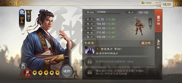 1、等到游戏中剧情进行到背盟败约之后,就会开启郭嘉招募,所以现在大家先了解三国志战棋版郭嘉战法搭配攻略是非常有用的。而且从现在了解到的郭嘉具体属性和战法来看,绝对是很多流派核心。当然后期强化过程也是必不可少的操作,尤其是在战法搭配方面,为了突出自带技能优势,一定要慎重选择。